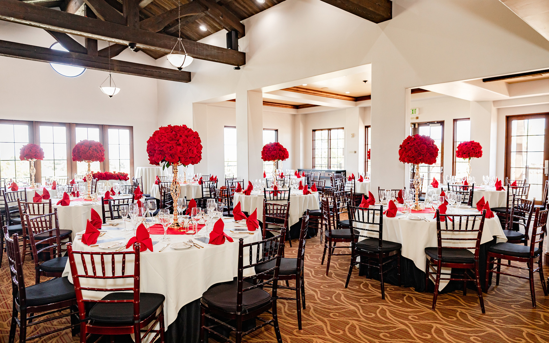 The Lakeview Room boasts a long balcony overlooking our Nicklaus-designed golf course. With views of the Saddleback Mountain, it’s the best view from the Clubhouse. The quaint private event space has a show-stopping wooden plank ceiling.