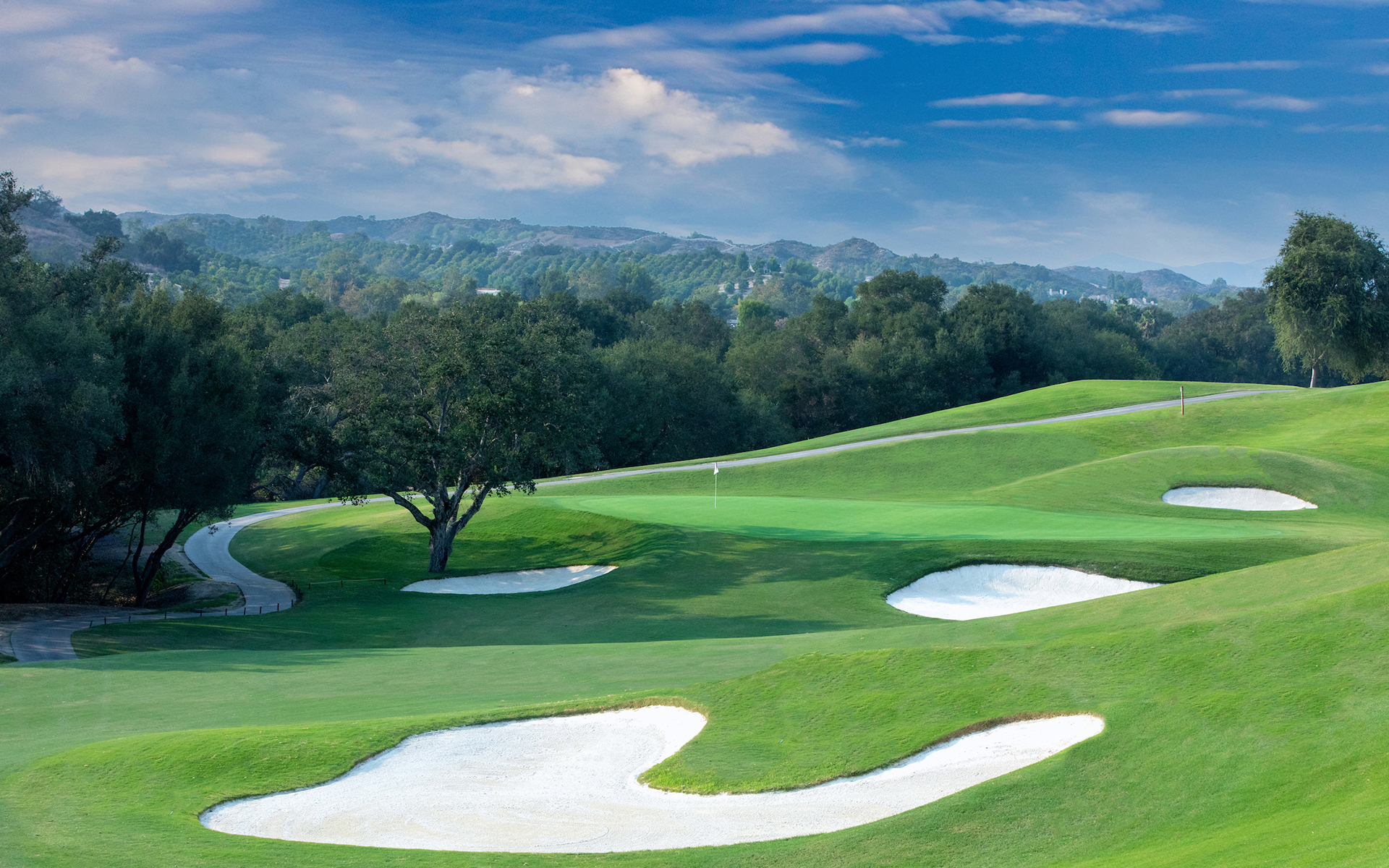 The course opens with its signature 601-yard par 5, which is considered one of the best starting holes in southern California. A 170-yard carry is required off the tee to clear a ravine followed by a lay-up second shot that must avoid the seven bunkers guarding the left side of the fairway. The green on this hole is narrow, so a premium is placed on distance control on the approach.