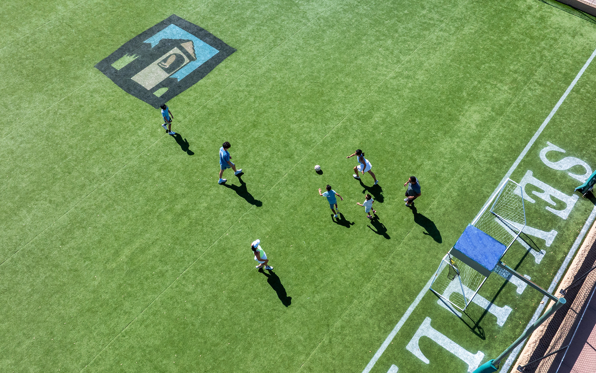 Our multi-facility Sports Zone is the place to put your athletic prowess to the test. The 10,000-square-foot artificial turf field is available for a myriad of sports activities including soccer, lacrosse, dodgeball, football, Wiffle ball, functional and agility training, and so much more. It also features three hard surface tennis courts, three pickleball and junior tennis courts, a half-court basketball court, a batting cage and an outdoor boxing and exercise area. If you prefer to stay on the sidelines and watch the action, you can enjoy sitting on our authentic stadium seats from Yankee Stadium, Fenway Park, Cowboys Stadium, Camden Yards and Shea Stadium.